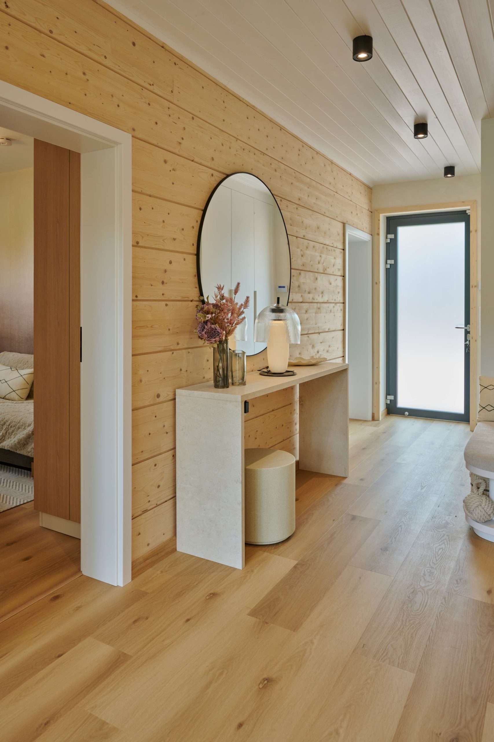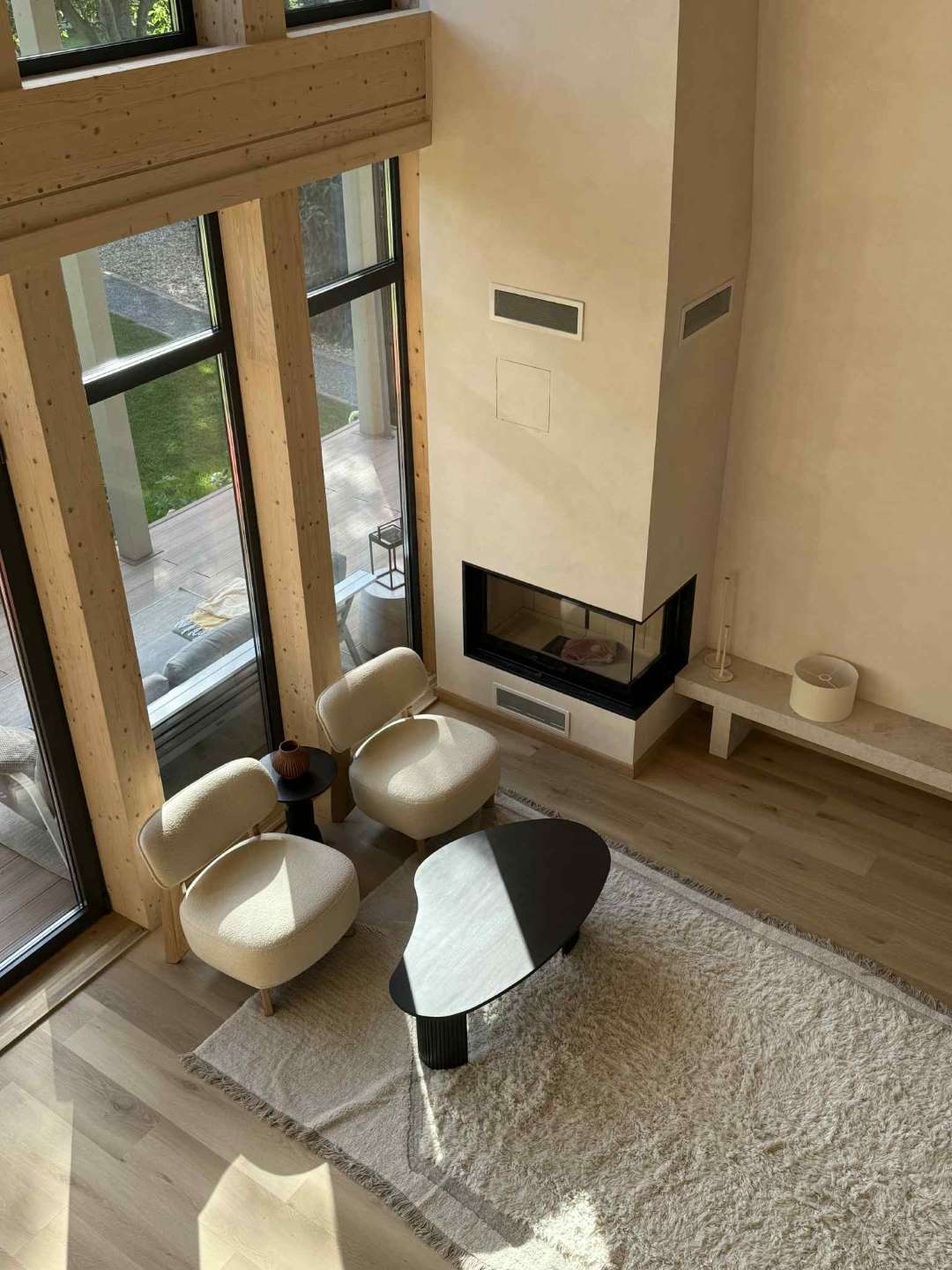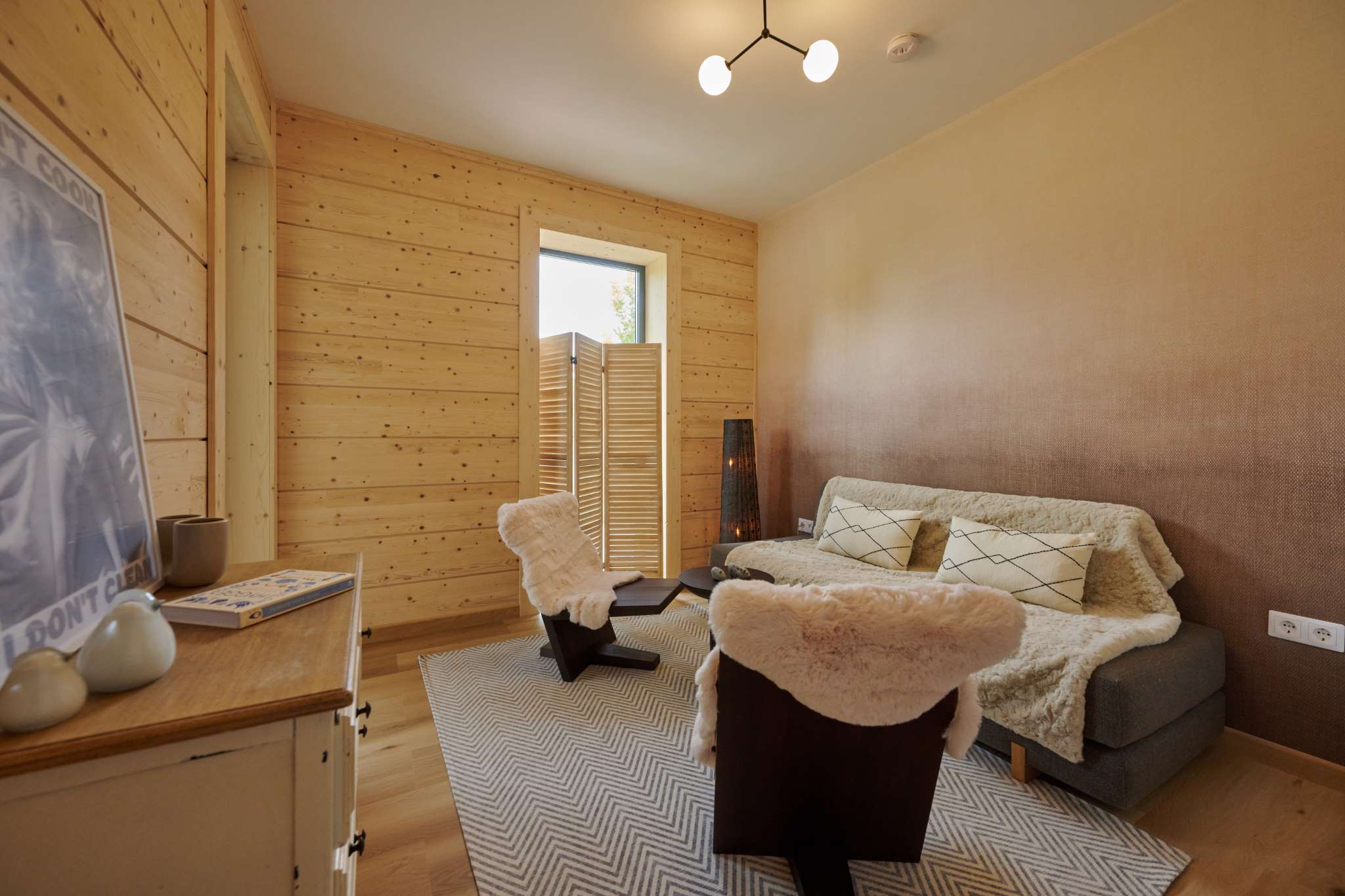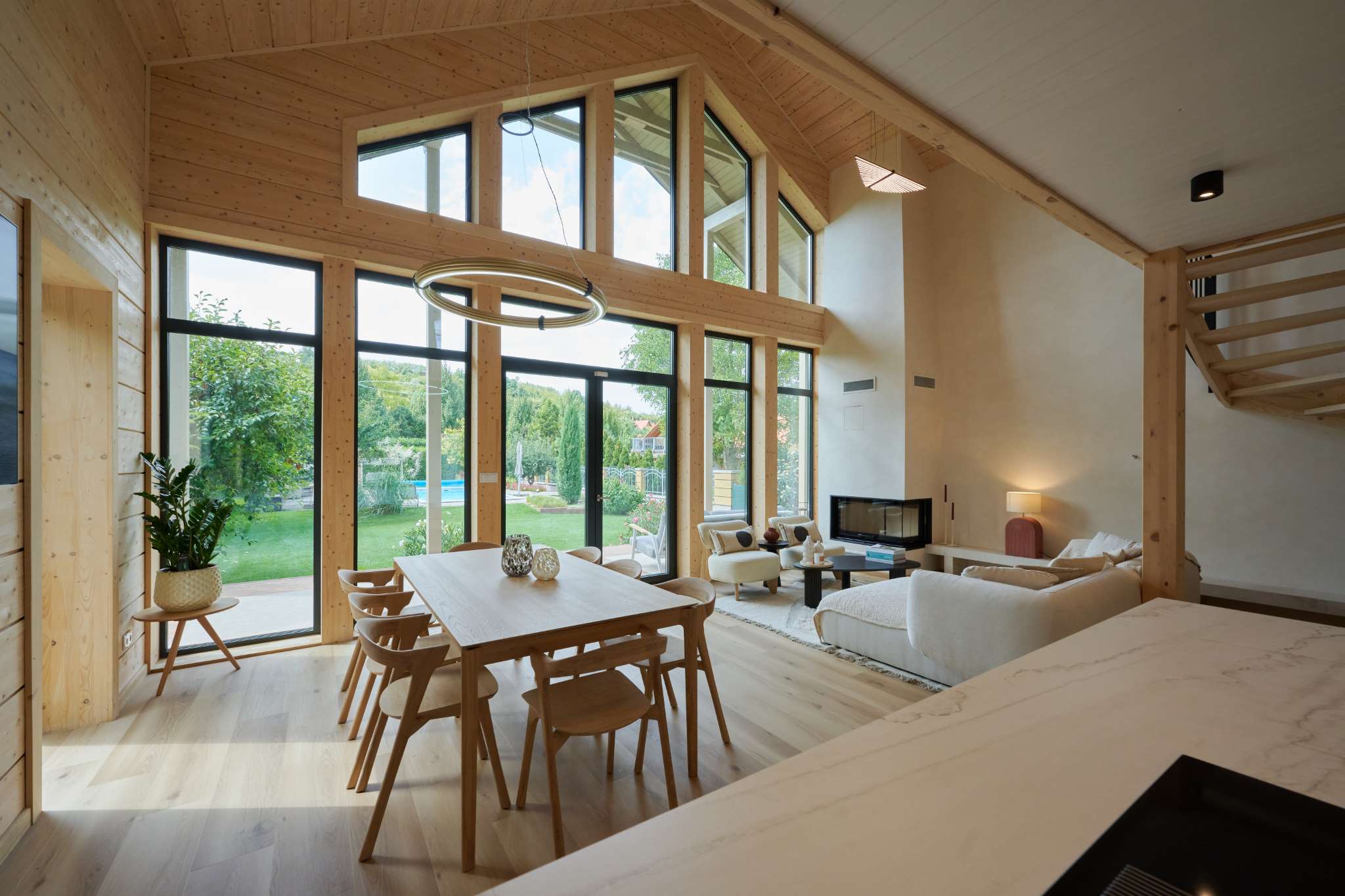 A természetközeli luxus itt nem hivalkodás, hanem minőség és harmónia: fenyőgerendás szerkezet, természetes kőburkolatok, nordic design lámpák, finom színek és textúrák.