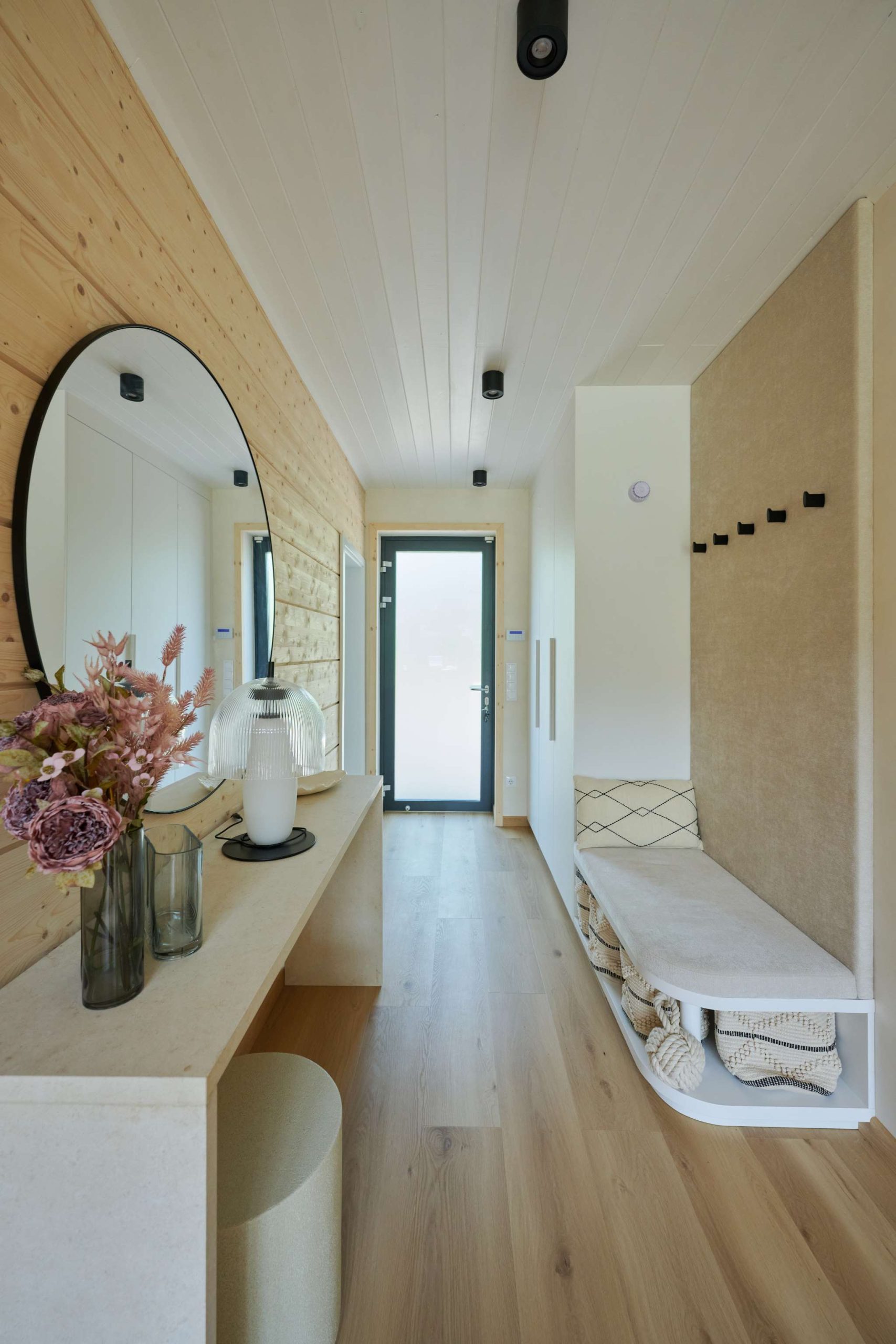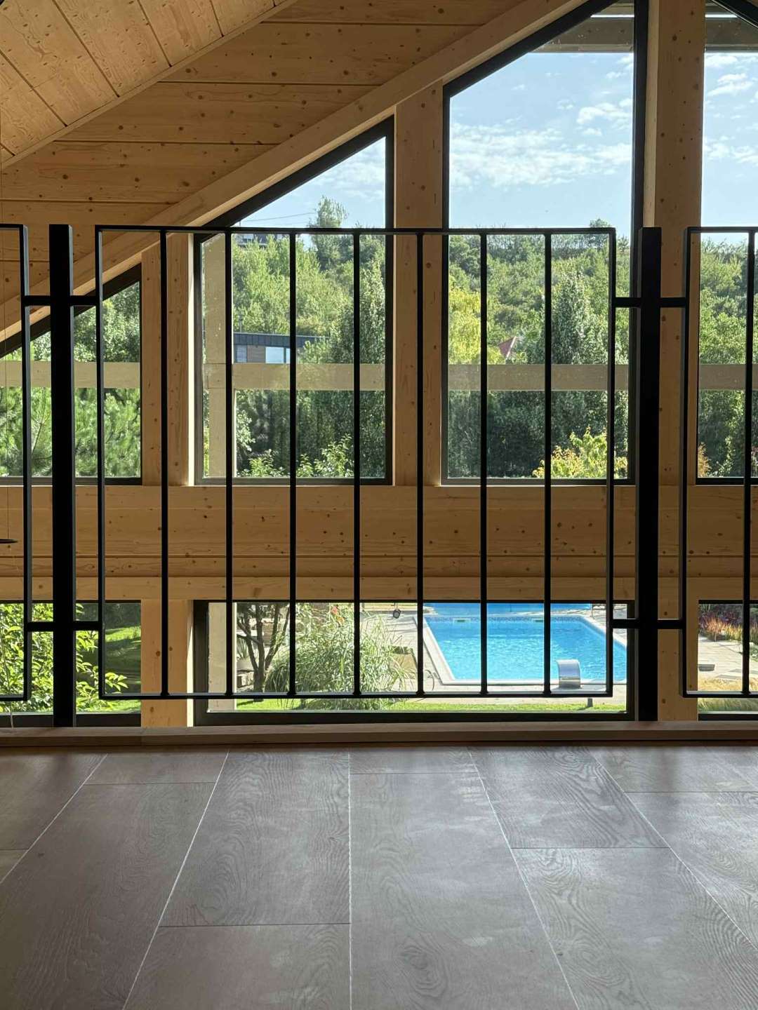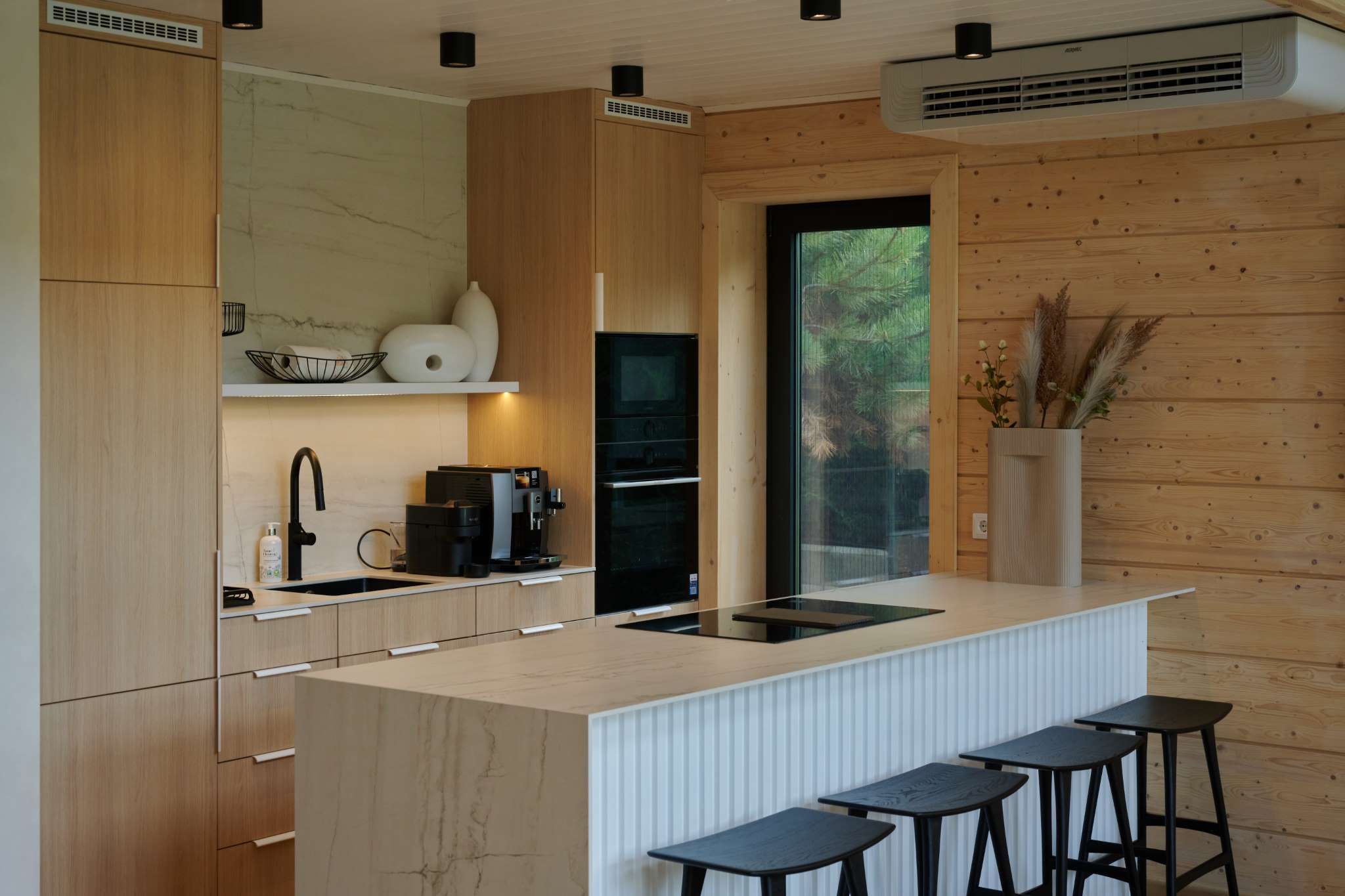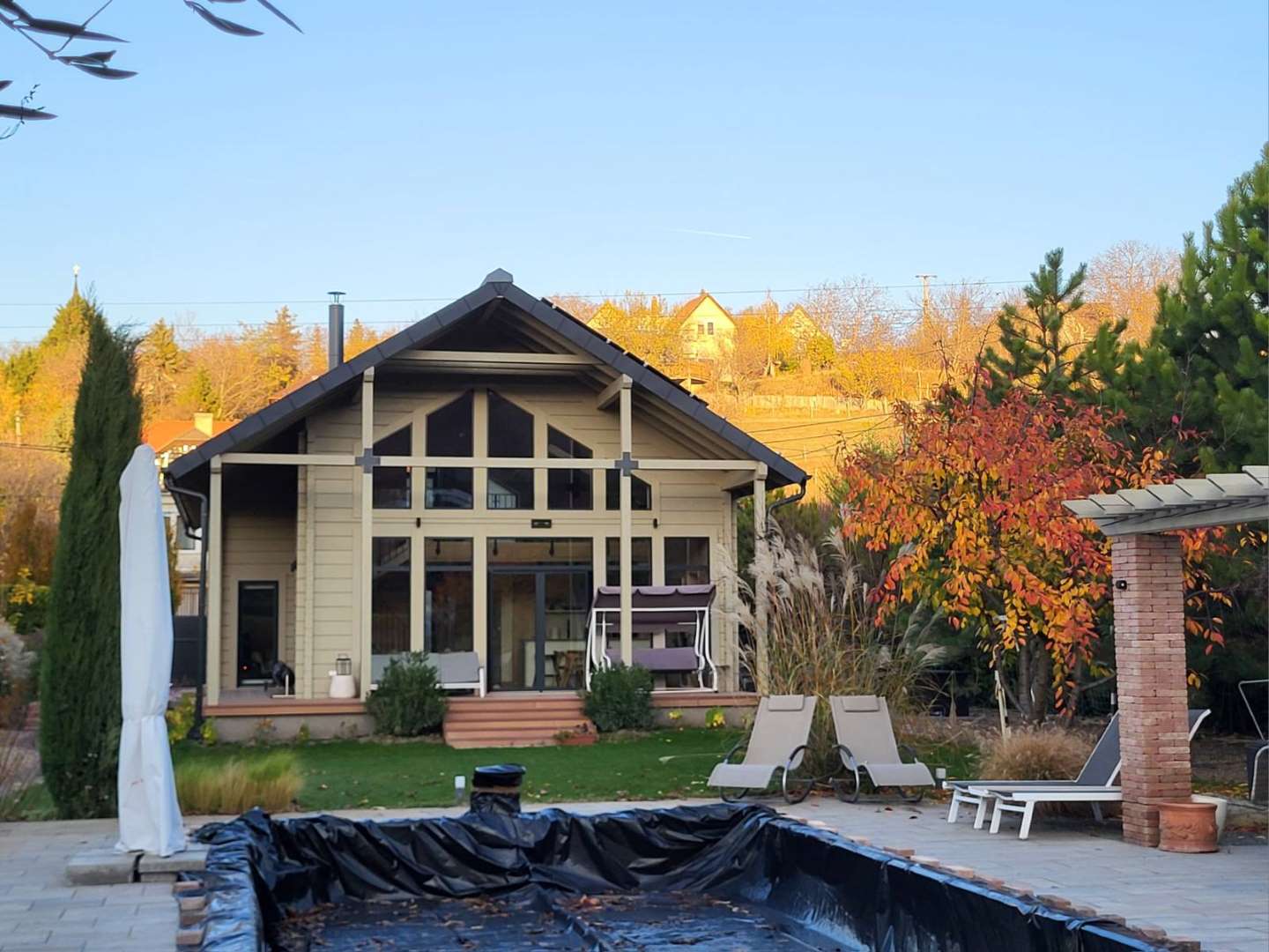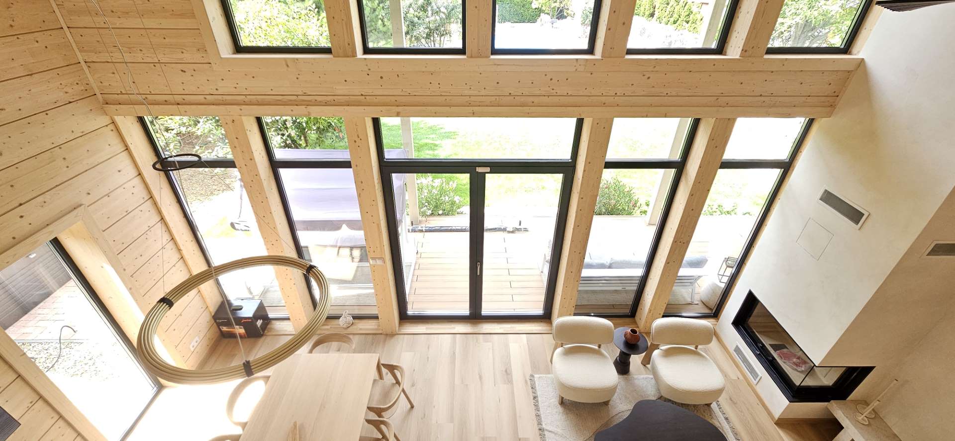 A természetközeli luxus itt nem hivalkodás, hanem minőség és harmónia: fenyőgerendás szerkezet, természetes kőburkolatok, nordic design lámpák, finom színek és textúrák.