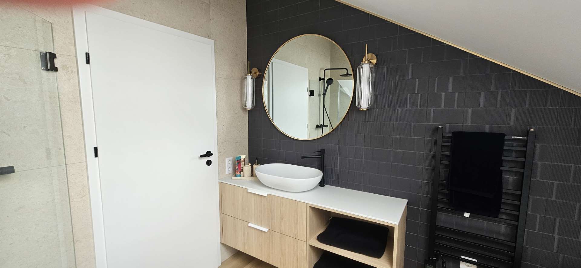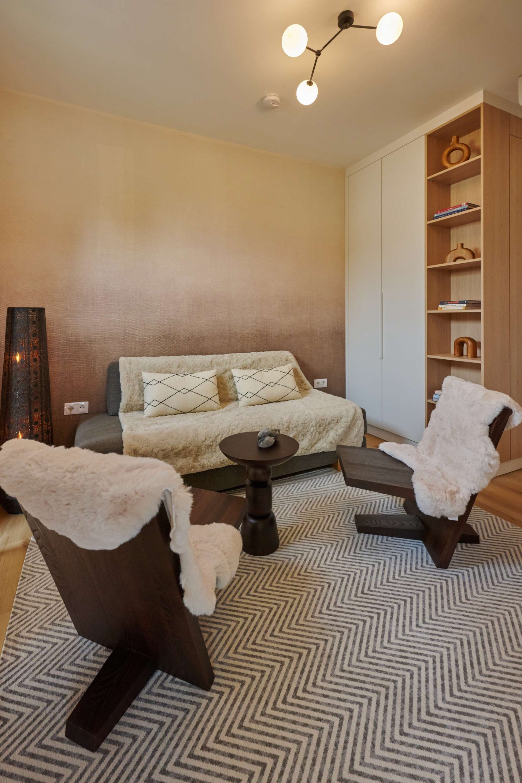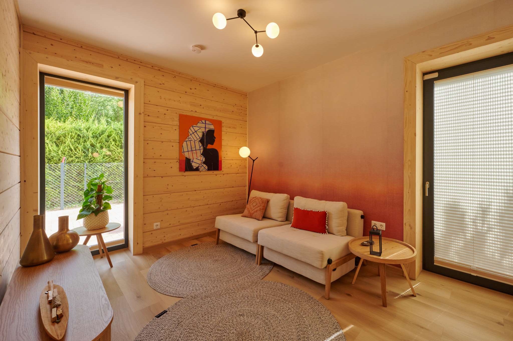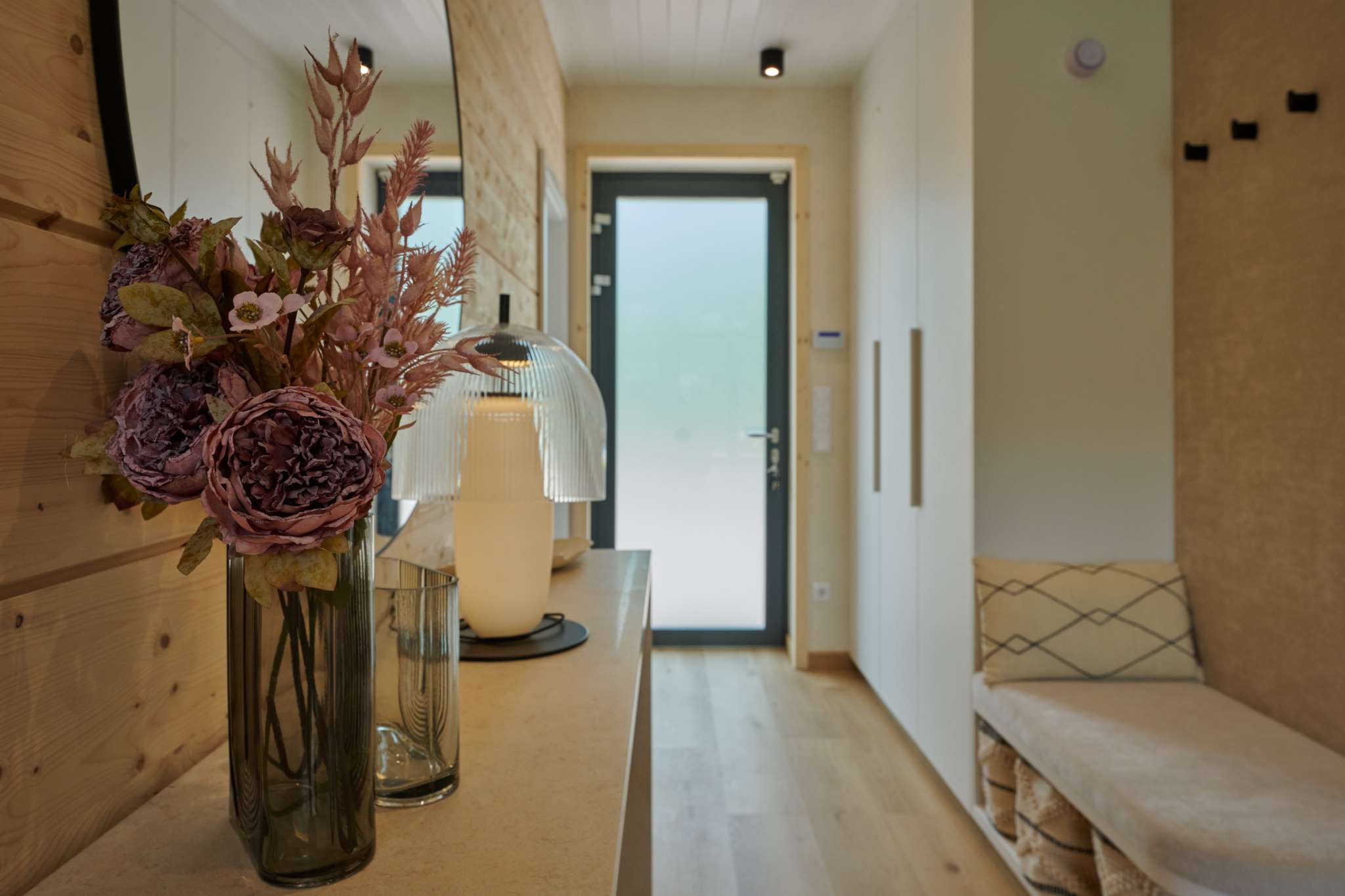 A természetközeli luxus itt nem hivalkodás, hanem minőség és harmónia: fenyőgerendás szerkezet, természetes kőburkolatok, nordic design lámpák, finom színek és textúrák.