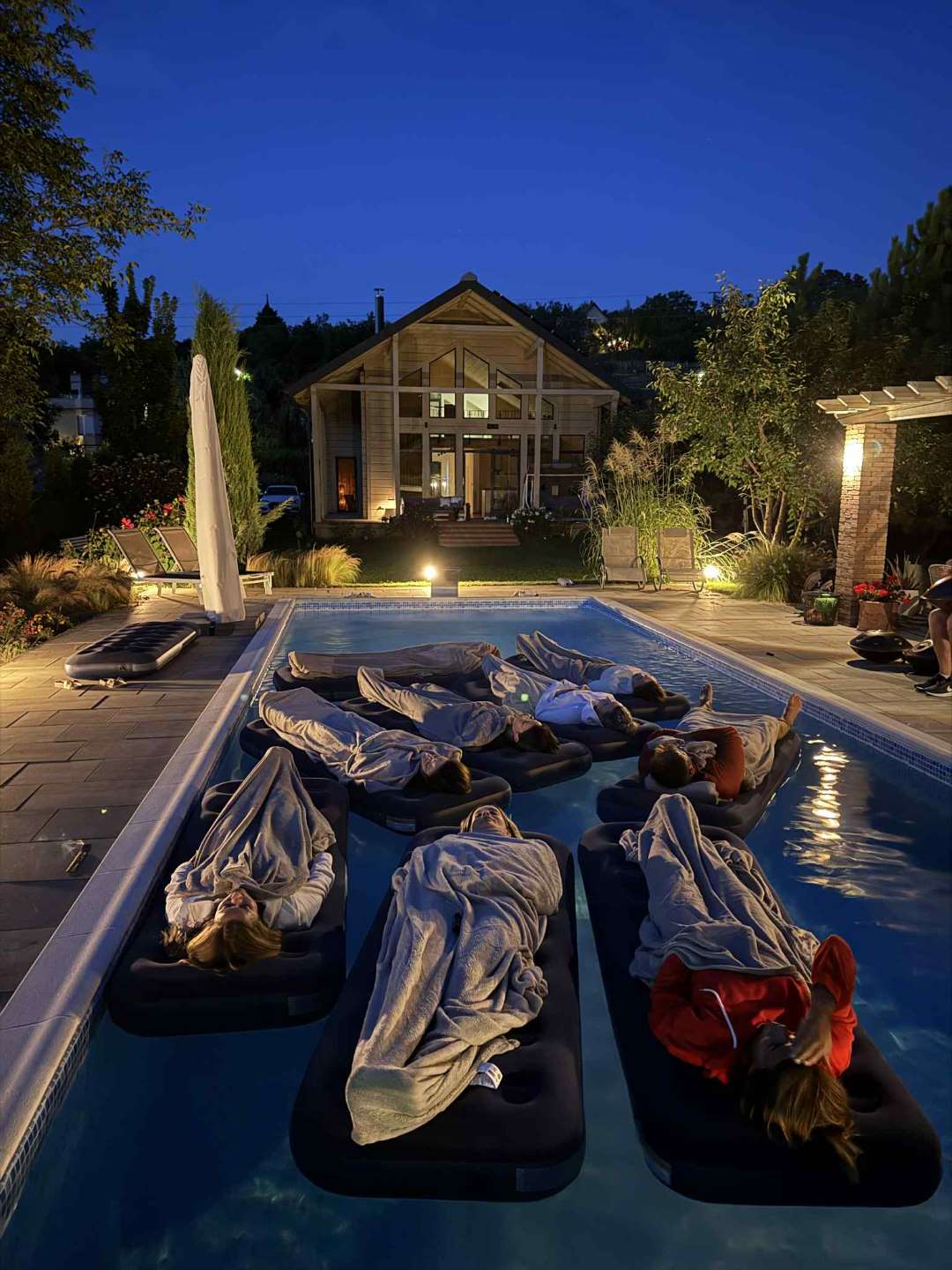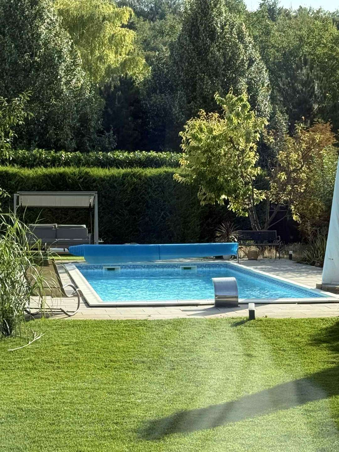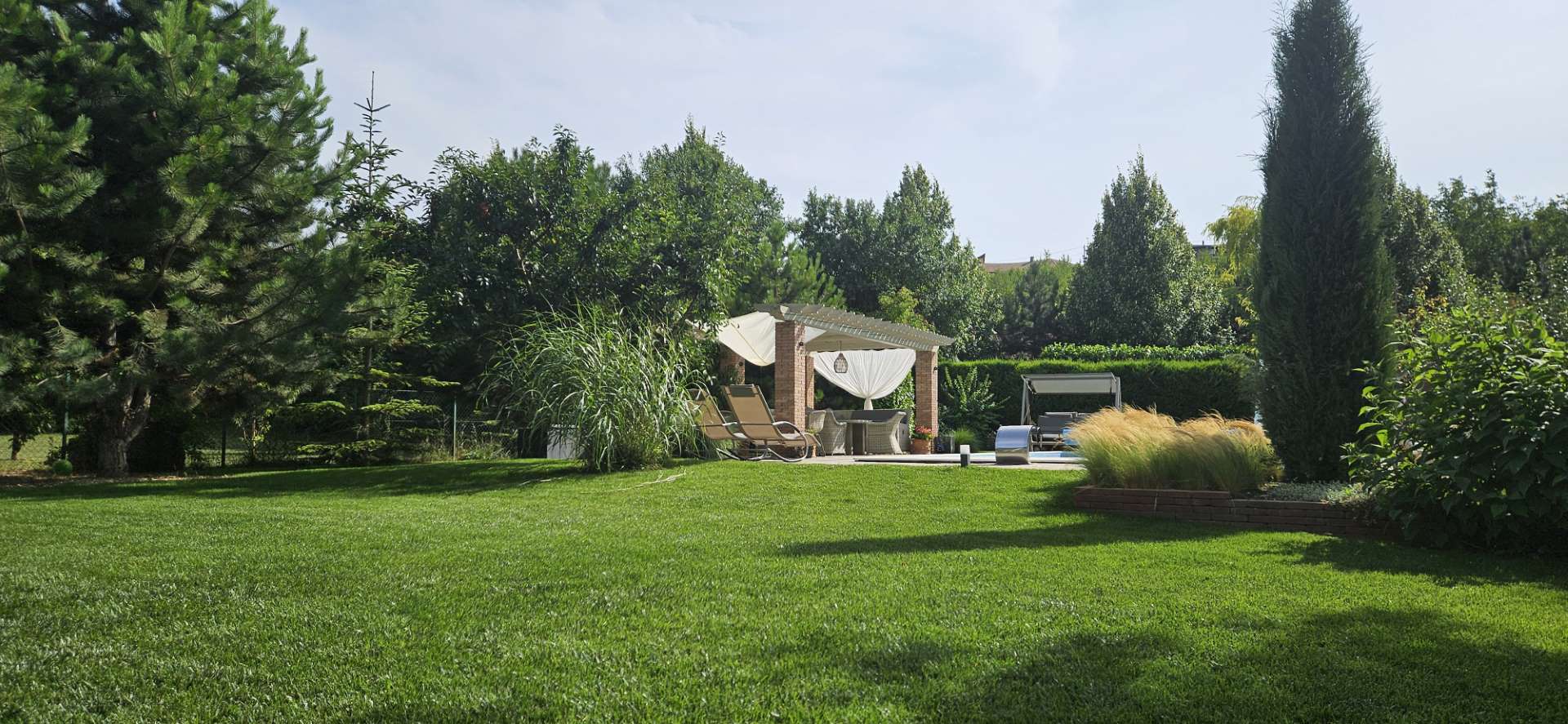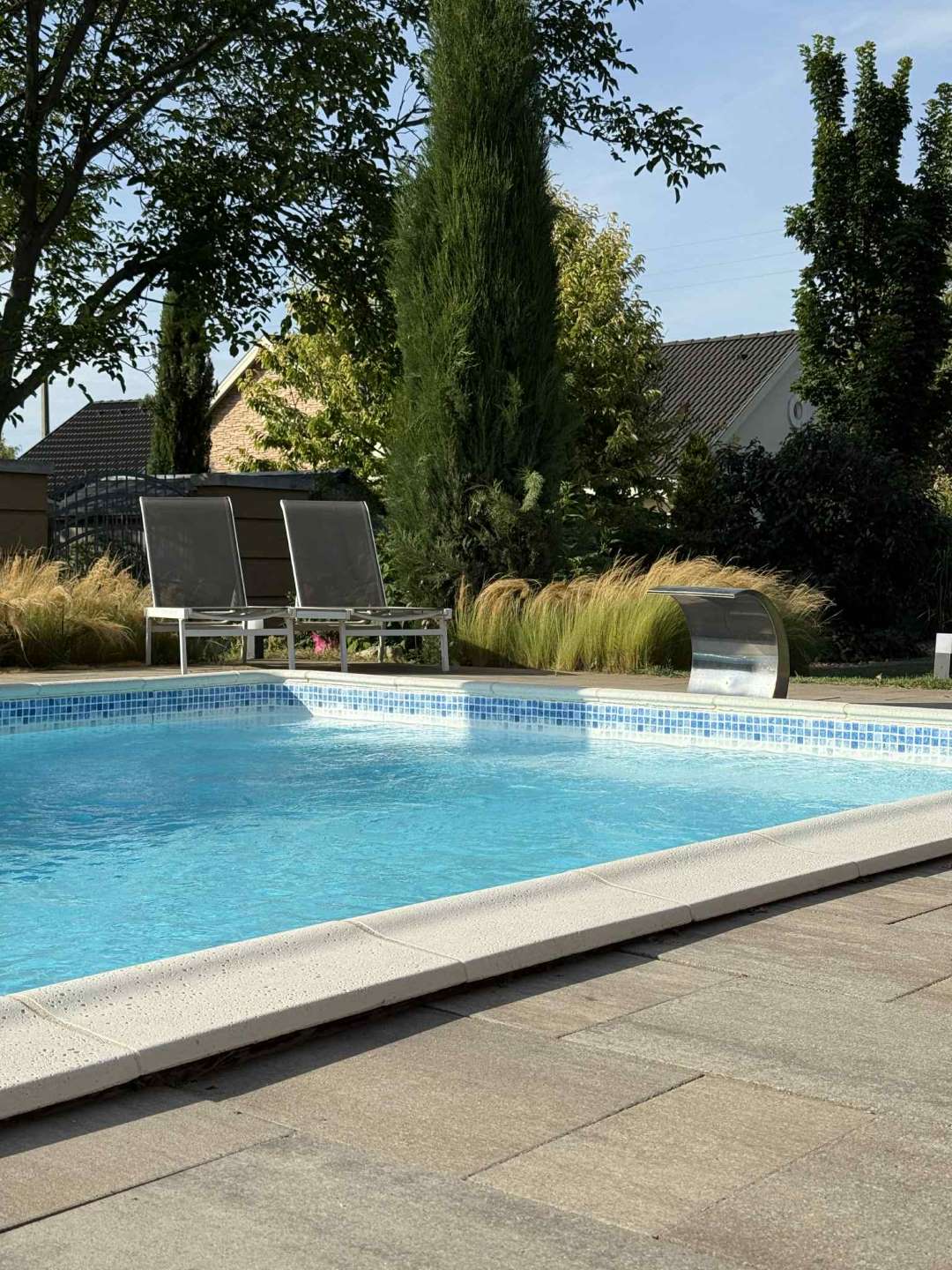 Tavasztól őszig 1000 m²-es kert és 12×4 m-es fűtött medence biztosítja a relaxációt.