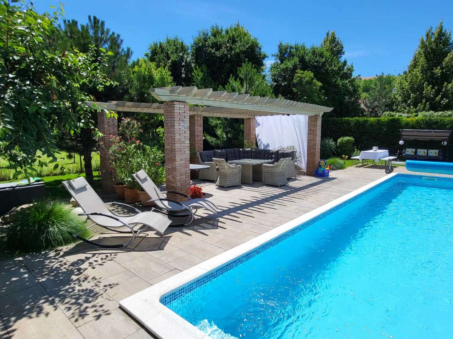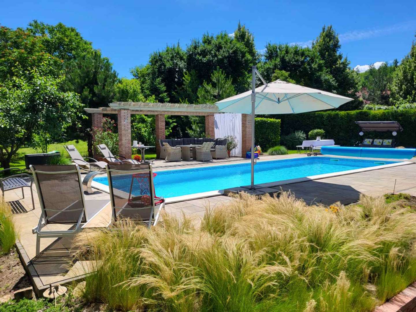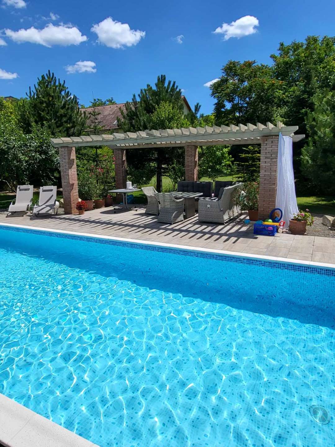 kertkapcsolatos terasz, fűtött, ellenáramoltatós medence, grillezési lehetőség